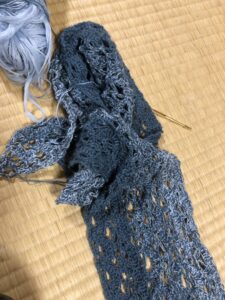 やっぱり作るならショールかなと思い編み始めたのですが、かぎ針編みだと結構時間がかかりますね。それに、最初にネットで編み図を見て編み始めたショールがなんかイマイチだったので、途中でほどいて最初からやり直したので、1ヶ月近くかかって、まだこの状態です。